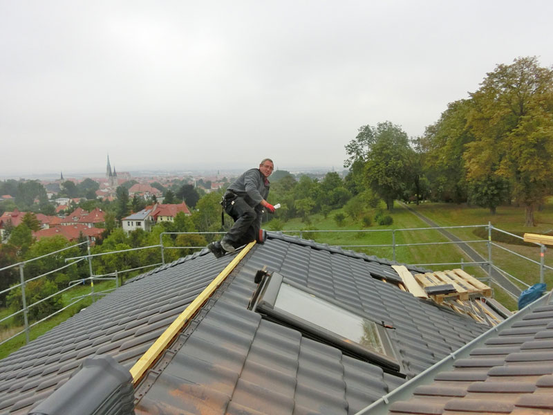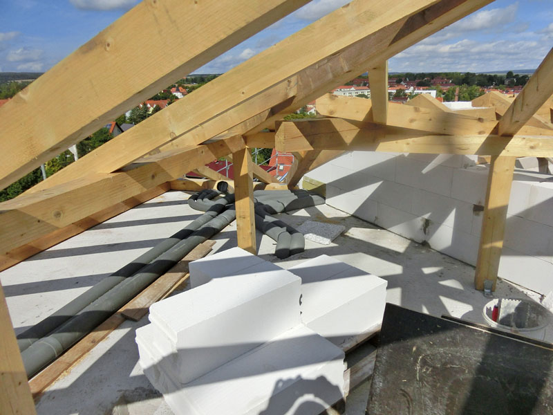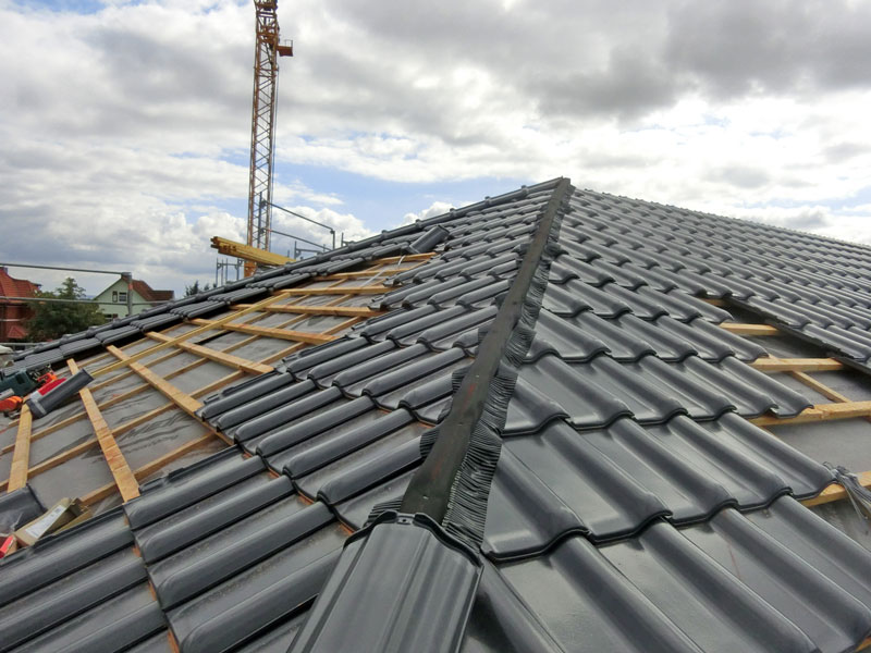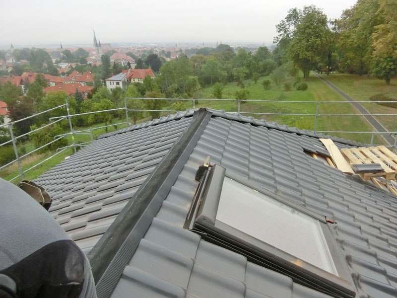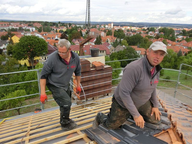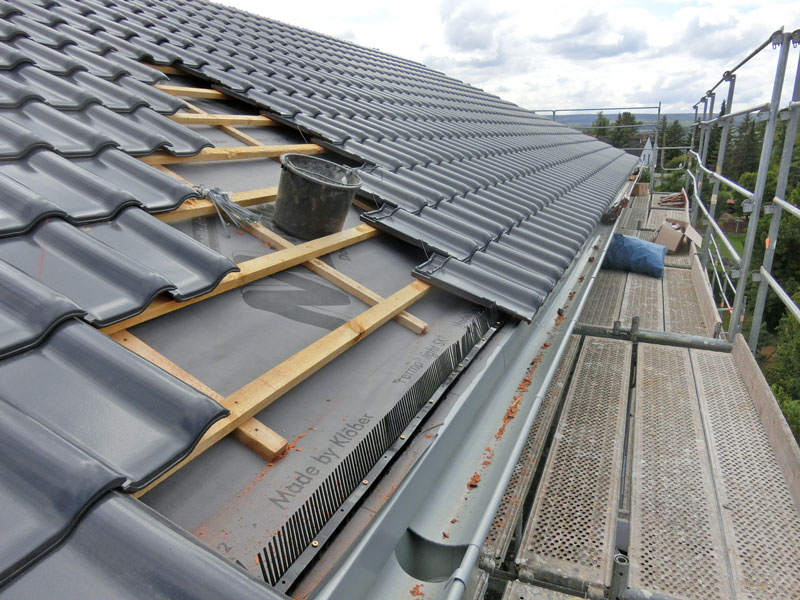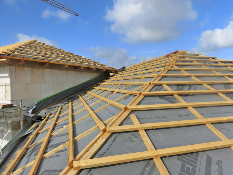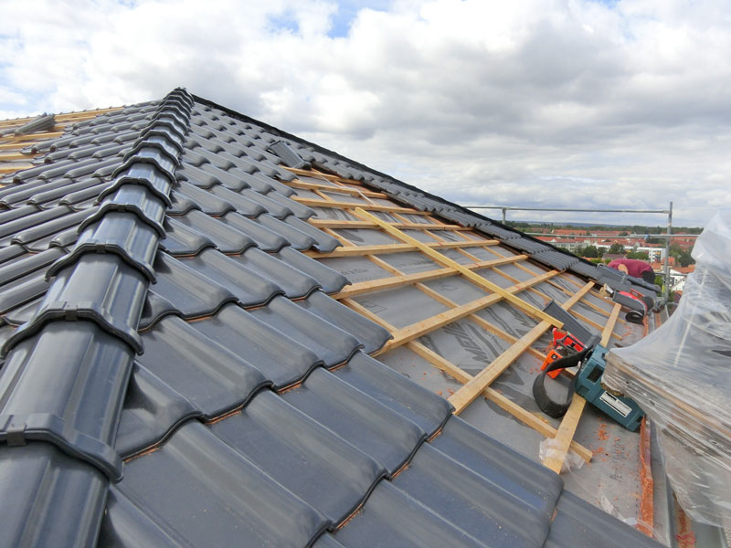 Unsere Leistungen: Dachaufbau, Aufbringen von Dämmung und Abdichtungsbahnen, Eindeckung mit Dachziegeln, incl. Blitzschutz