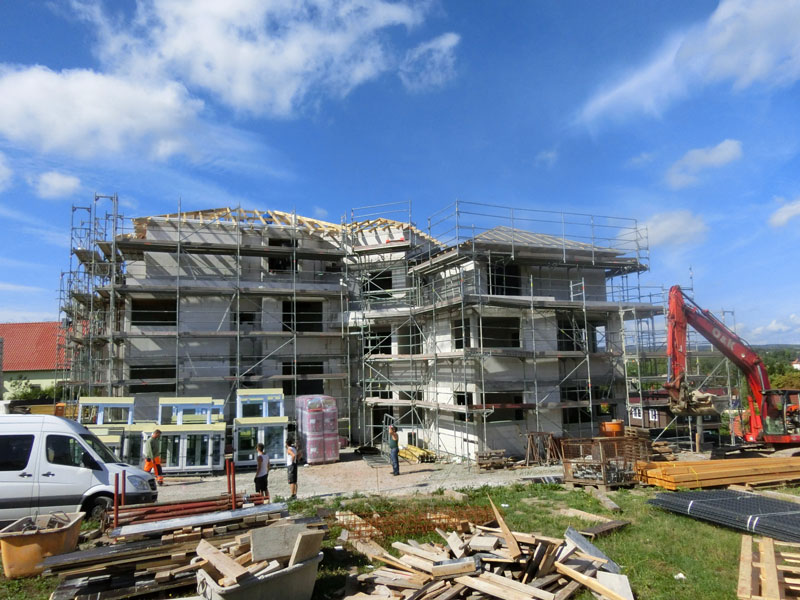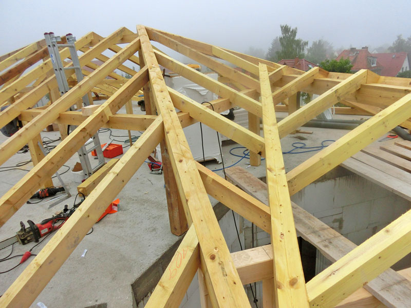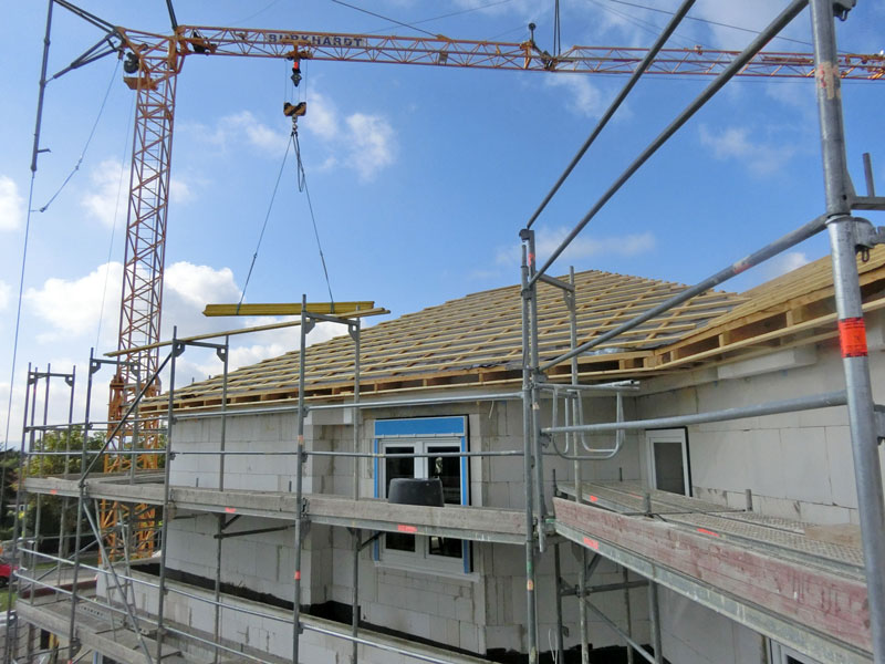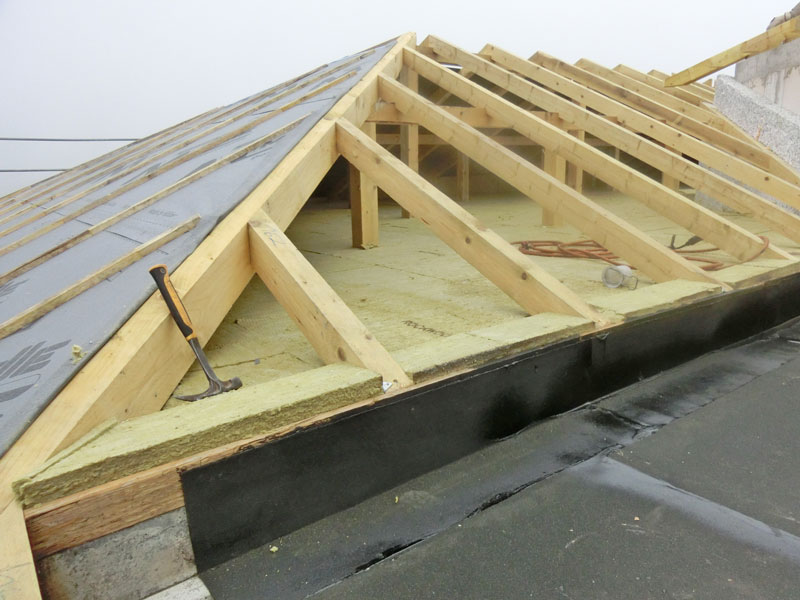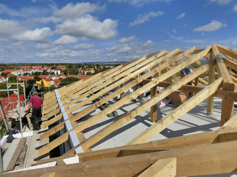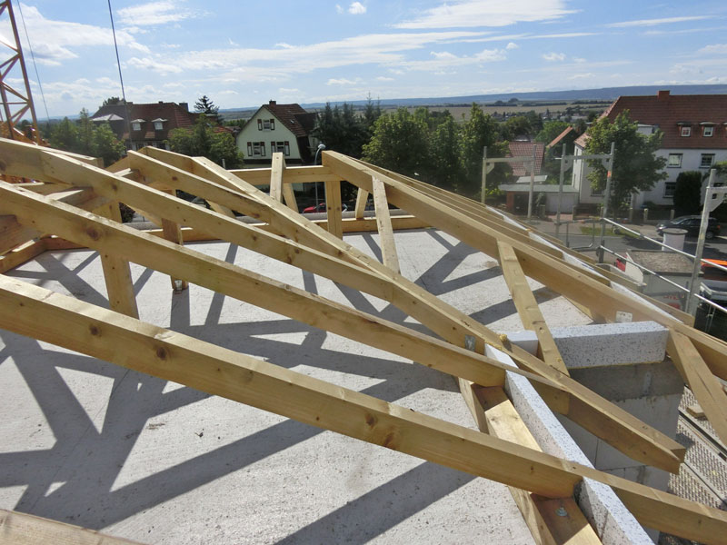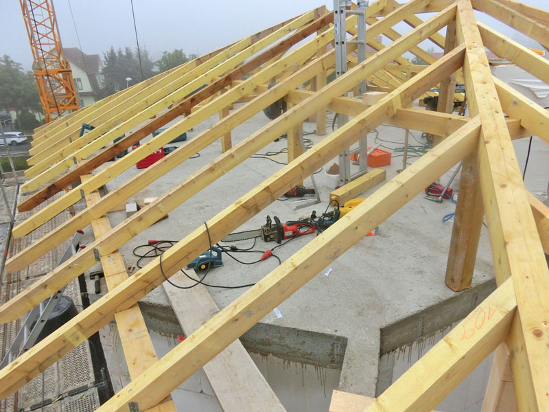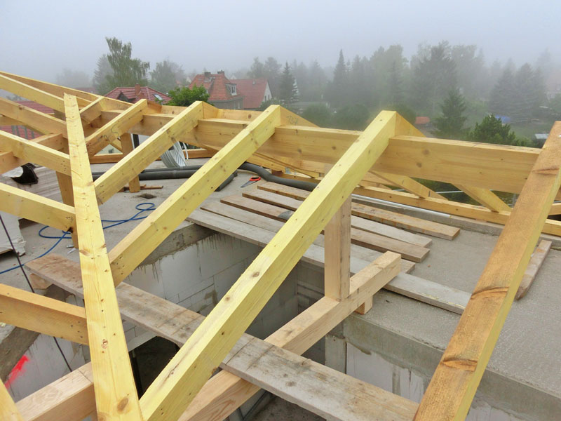 Unsere Leistungen: Dachaufbau, Aufbringen von Dämmung und Abdichtungsbahnen, Eindeckung mit Dachziegeln, incl. Blitzschutz