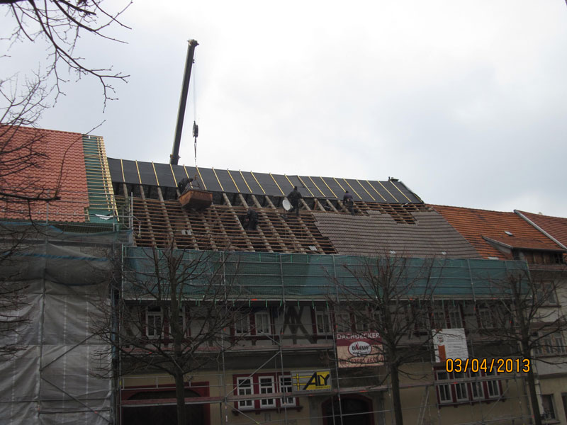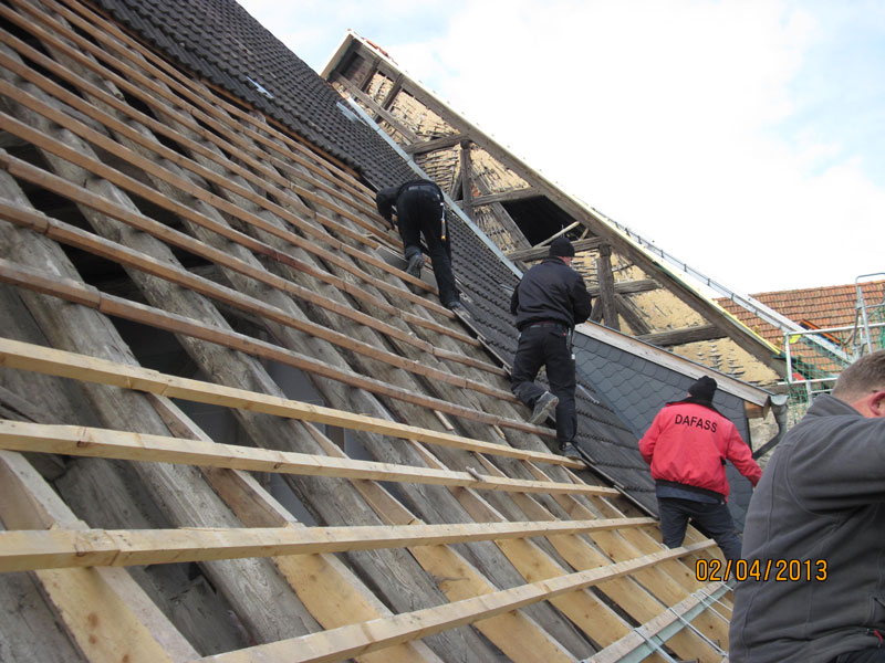 Unsere Leistungen: 500 m² Dachsanierung mit Tondachziegeln, , incl. Entfernung des alten Dachbelages, Entfernung der alten Dämmung und alten der Dachrinnen und Neueindeckung
