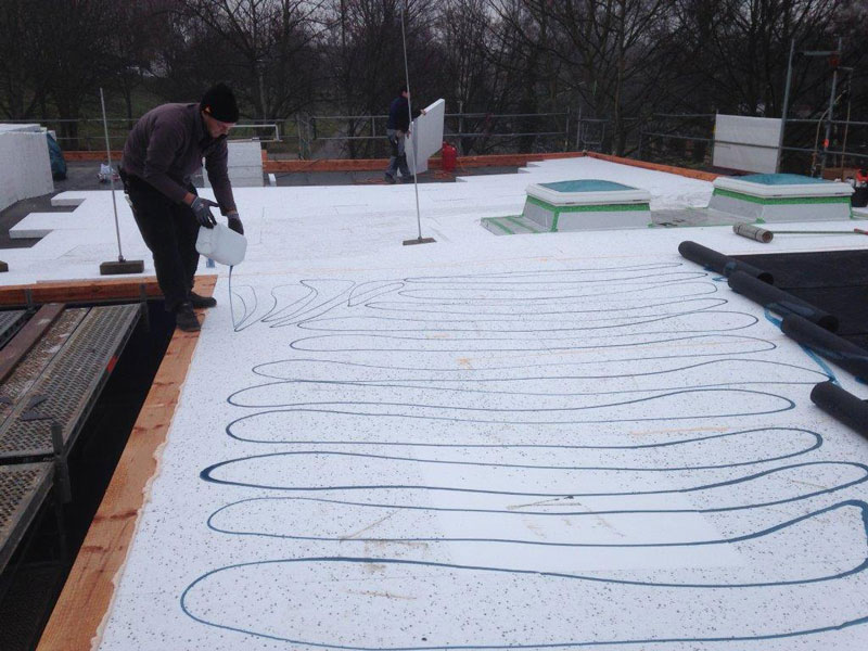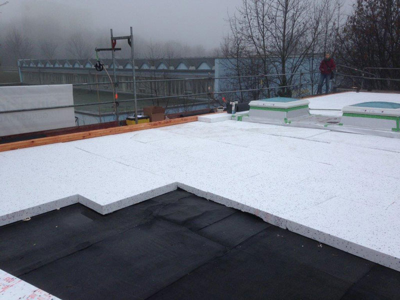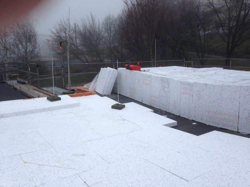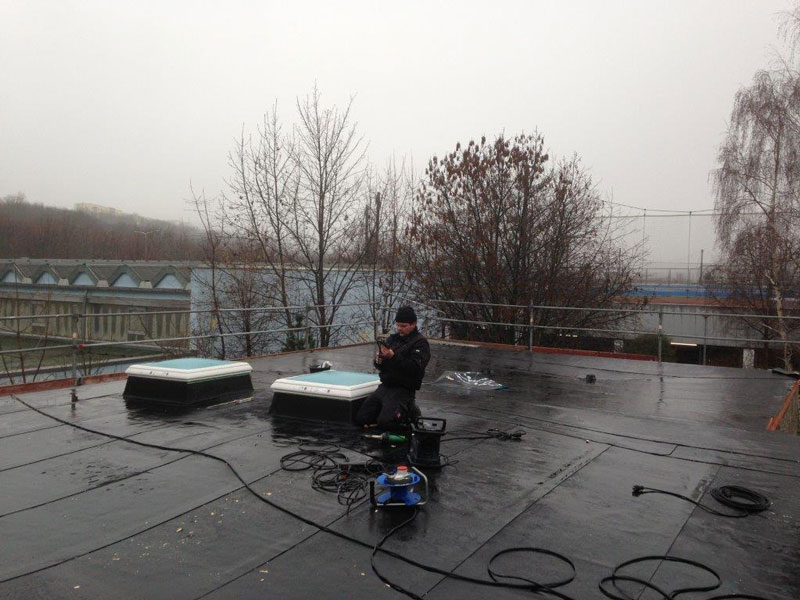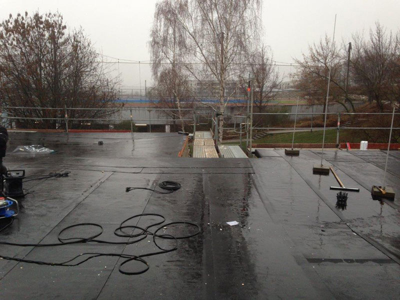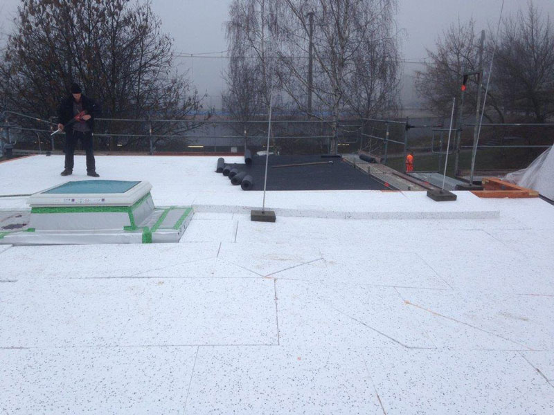 Unsere Leistungen: ca. 300 m² Dachabdichtungsarbeiten, Dachabdichtung mit Dampfsperre, Einbau von Lichtkuppeln und Dachklempnerarbeiten