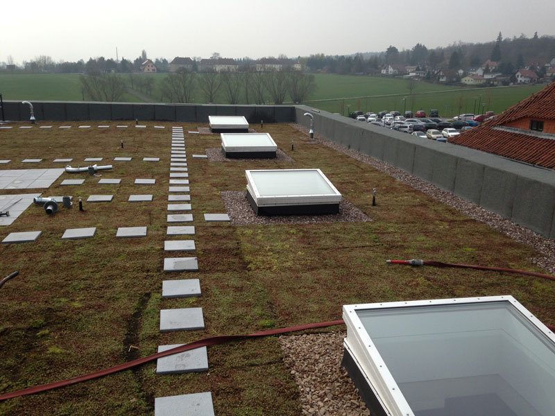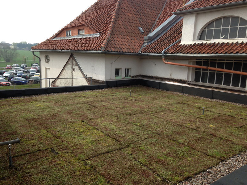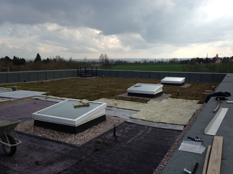 Unsere Leistungen: ca. 500 m² Dachabdichtungsarbeiten mit Dampfsperre , Einbau von Lichtkuppeln, Dämmung, ca. 100 m² Dachbegrünung, Einbau von Sekuranten und Verlegung eines Wartungsganges