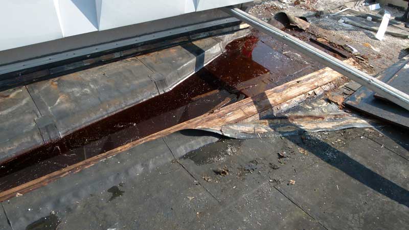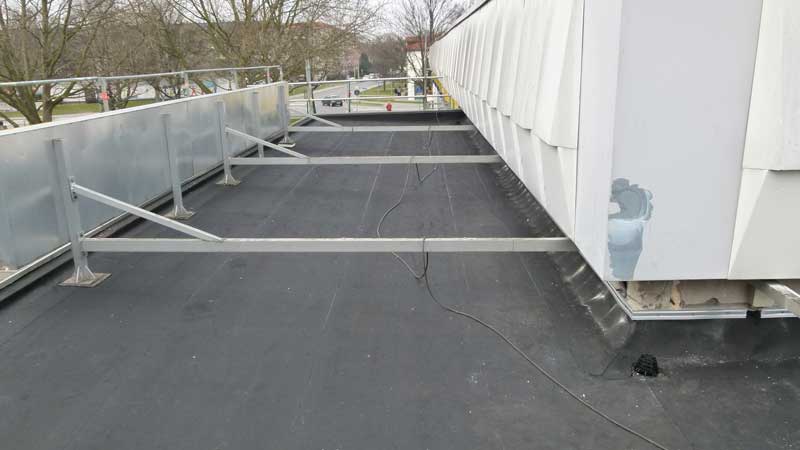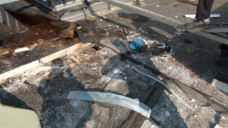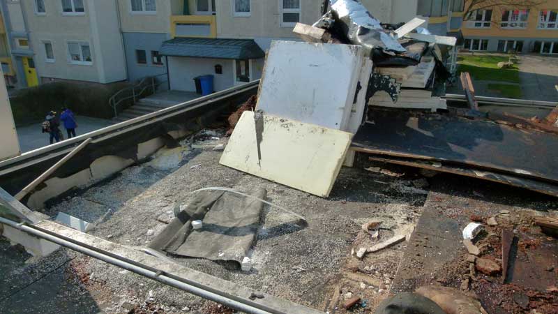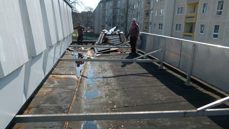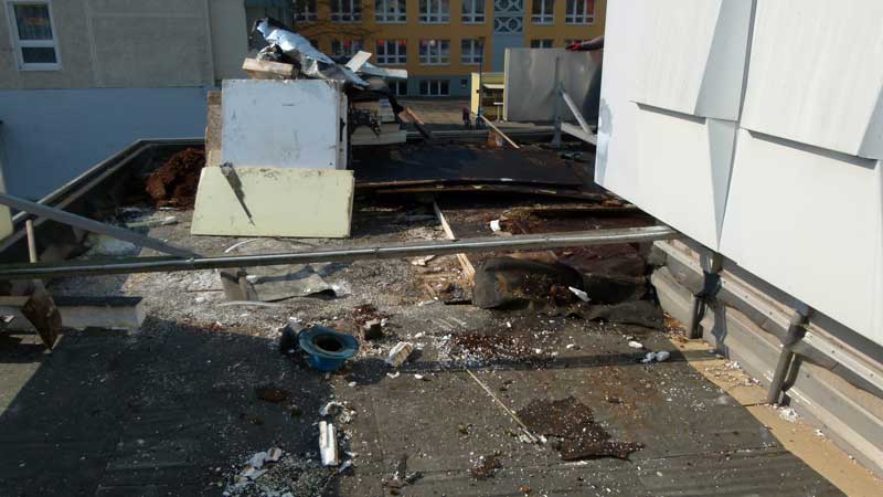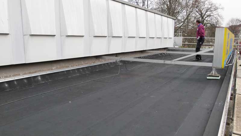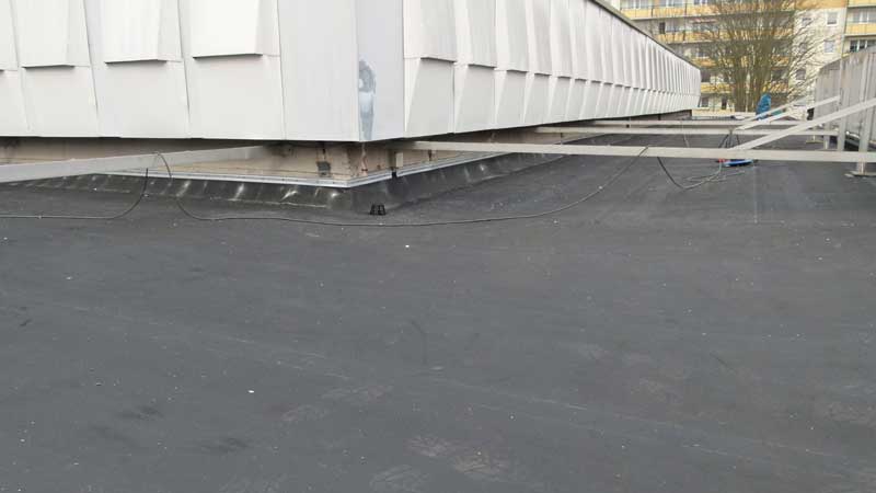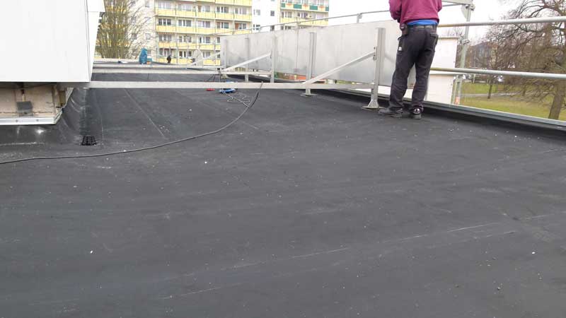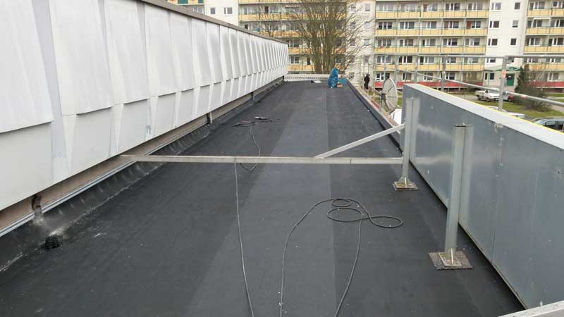 Unsere Leistungen: Entfernung der alten Dachabdichtung ca. 200m², Austausch der Gullys, Aufbringen neuer Dämmung und Abdichtungsbahn