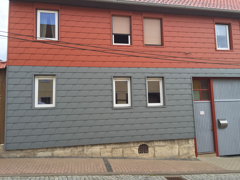 Unsere Leistungen: ca. 38 m² vorhandenen Fassadenbehang aufnehmen , Unterkonstruktion für neuen Fassadenbehang mit Dämmung anbringen sowie Aufbringen einer hochwertigen, modernen Fassadenverkleidung